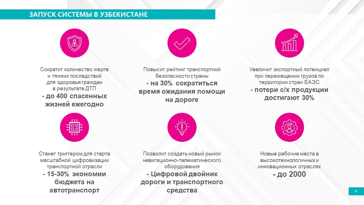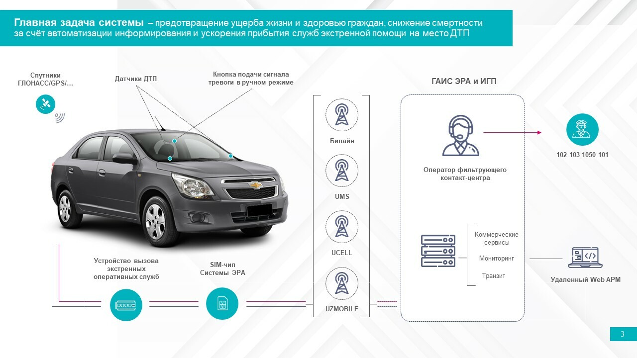 Платформа позволяет обеспечить снижение тяжести последствий от дорожно-транспортных и иных происшествий на автомобильных дорогах, и в перспективе оказывать широкий спектр геоинформационных и навигационных сервисов потребителям всех сегментов рынка (b2g, b2b, b2с). Основной функционал платформы – аварийное оповещение (передача экстренного вызова в службы экстренного реагирования/Систему-112) об авариях и иных инцидентах на дорогах.